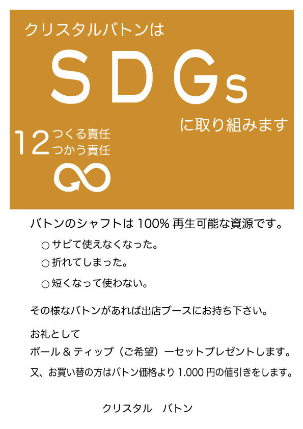 202209/16 第57回バトントワーリング関東大会一次発信について 大会予定kanto-baton 事務連絡事項等・・・この後提出して頂きたい事項もありますので熟読をお願い致します。 タイムテーブル・・・出演順は未定ですが、各部門・各部の出演時間帯をご確認ください。 広報部よりお知らせ・・・大会Instagramについてのお知らせです。是非ご参加ください。 出店業者アイケーより・・・SDGsの取り組みのご案内です。 持ち込みするバトンのボールとティップは取って持ち込んでください。 コメントは受け付けていません。