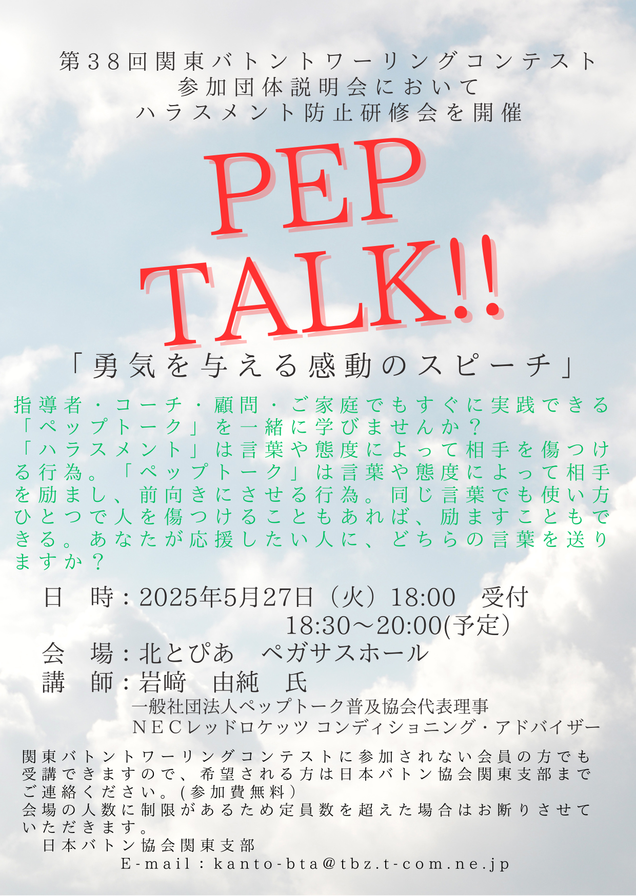 202505/21 第38回関東バトントワーリングコンテスト 参加団体 1次・2次資料を掲載いたします。 大会予定kanto-baton 第38回関東バトントワーリングコンテスト 参加団体 1次・2次資料を掲載いたします。 参加団体は資料を熟読の上コンテストにご参加くださいますようお願いいたします。 タイムスケジュール 大会事務局からの注意事項 大会の流れ フロア図 サブアリーナタイムスケジュール 会場案内図 2階座席図 ご来場のみなさまへ・ビデオ撮影者の皆様へ 写真・映像使用願い 関東支部よりお知らせ ハラスメント研修会 お知らせ 危機管理1~4 ソロストラット課題曲について ★棄権届用紙 コメントは受け付けていません。
